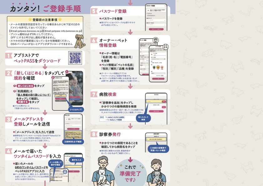 スマホ用予約システムアプリ「ペットPASS」ダウンロード、アカウント登録方法はこちらをご覧ください。